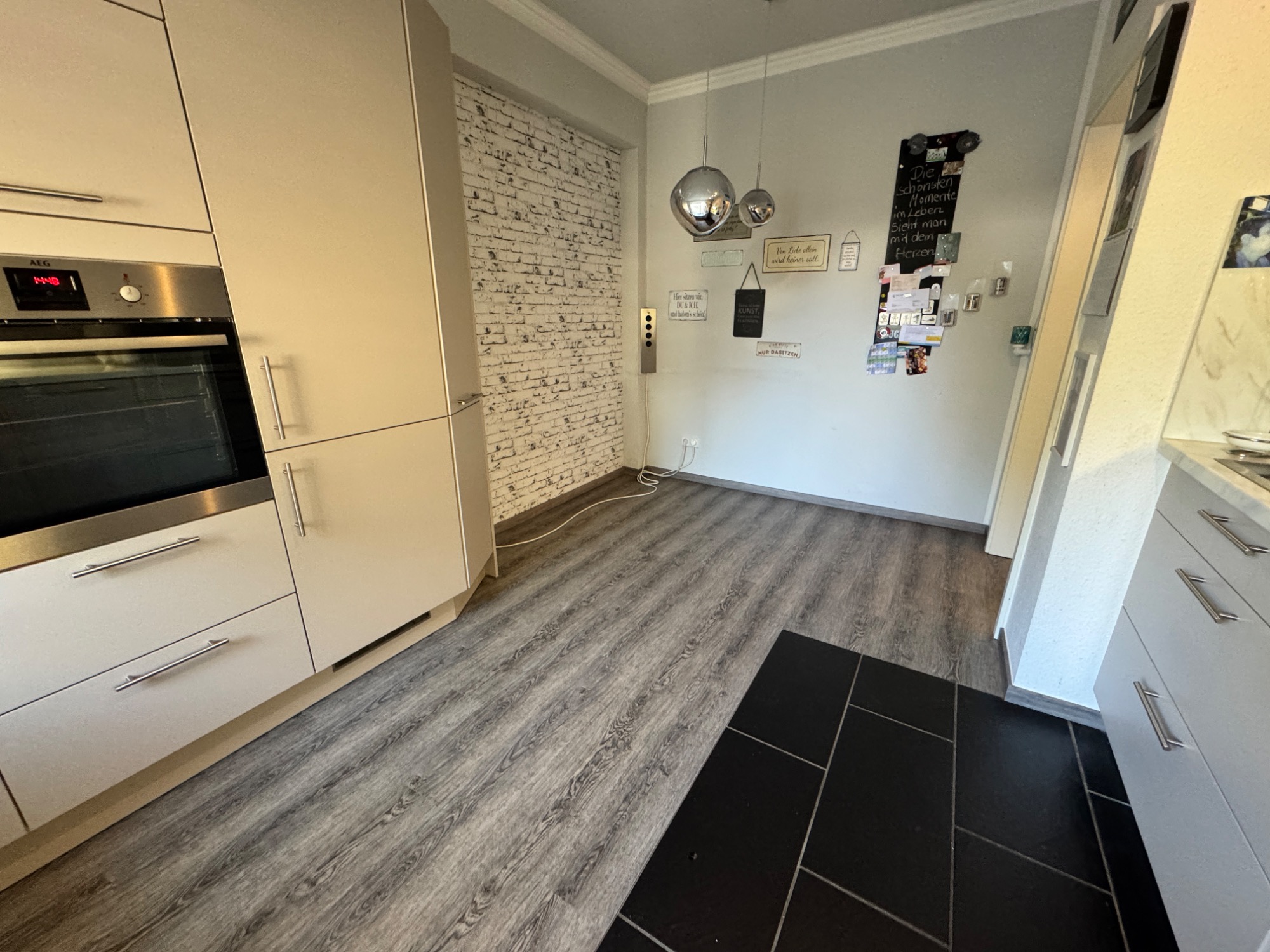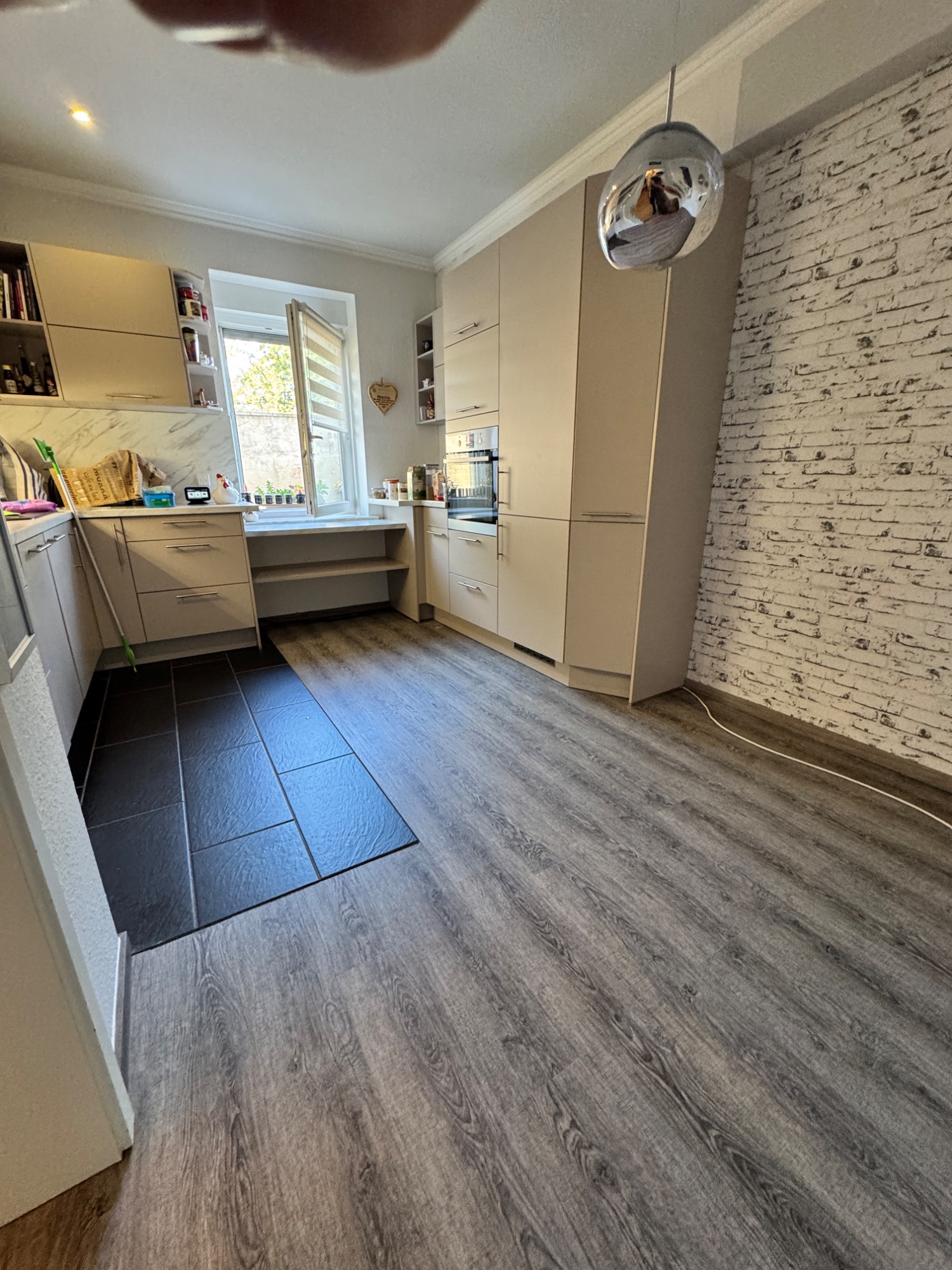 Das beschädigte Laminat sollte auf Kundenwunsch vor der Küche (hinter der Sockelleiste) abgetrennt werden. Der neue Bodenbelag wurde an die Schnittkante angearbeitet. Den Übergang zu Fließenboden haben wir neu angepasst.