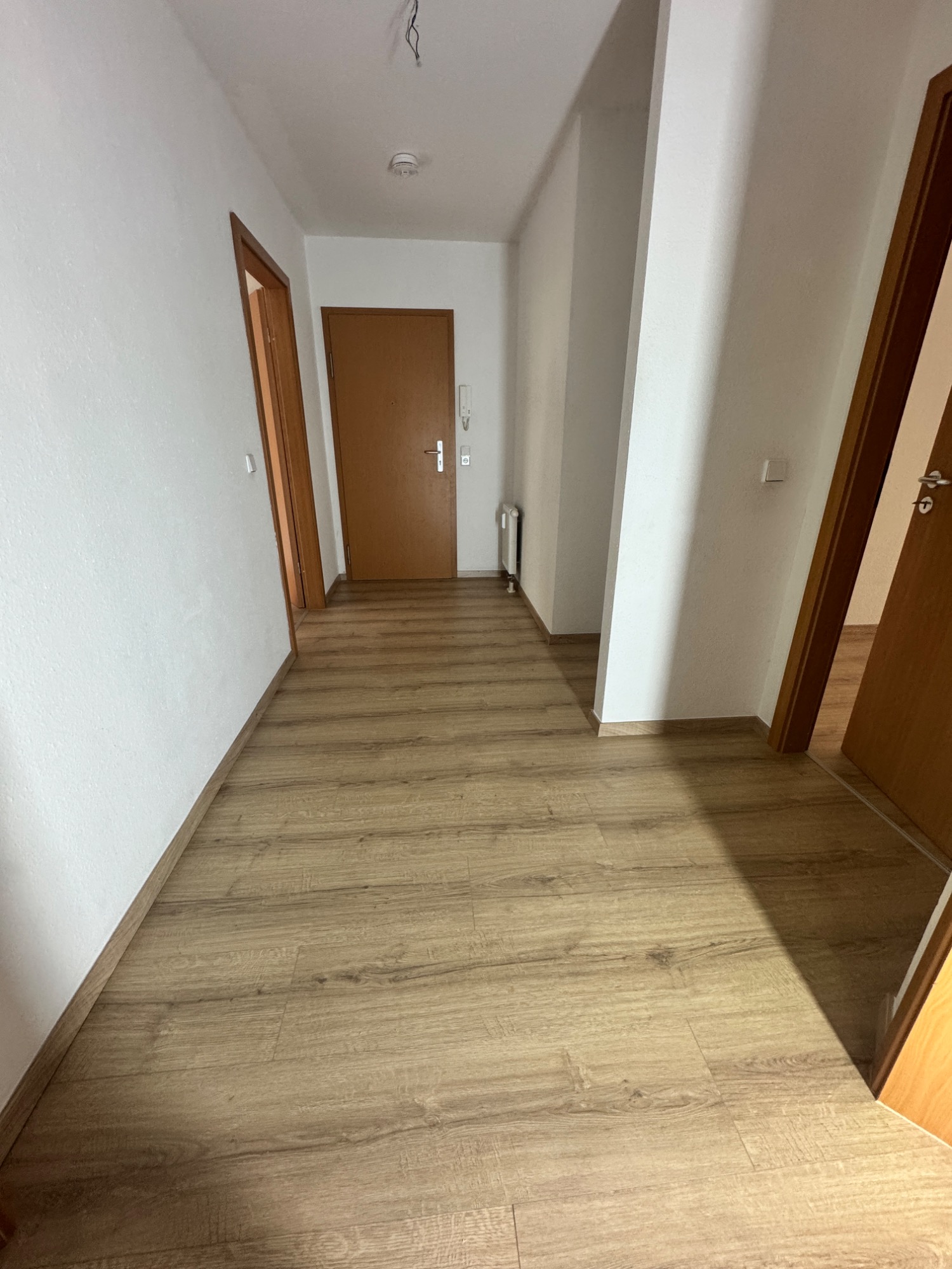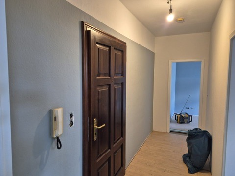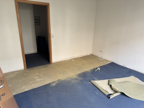 In einer 2-Raumwohnung war der vollflächig verklebte Teppichboden zu entfernen und zu entsorgen. Anschließend wurden in Flur, Wohnzimmer und Schlafzimmer Trittschall und Laminat neu verlegt. Umlaufend sind Sockelleisten in Laminatoptik zum Einsatz gekommen. Die Türblätter wurden angeglichen.