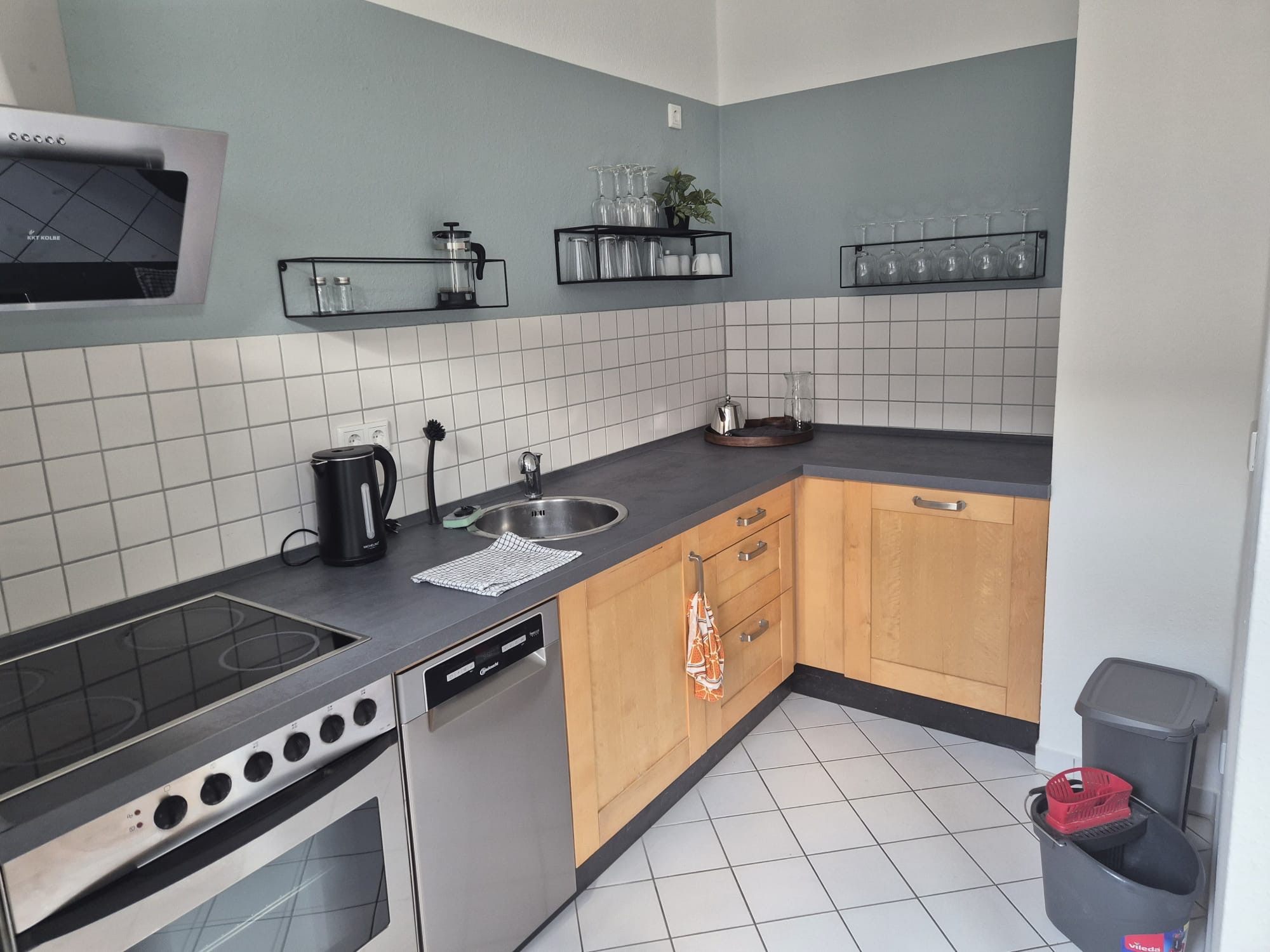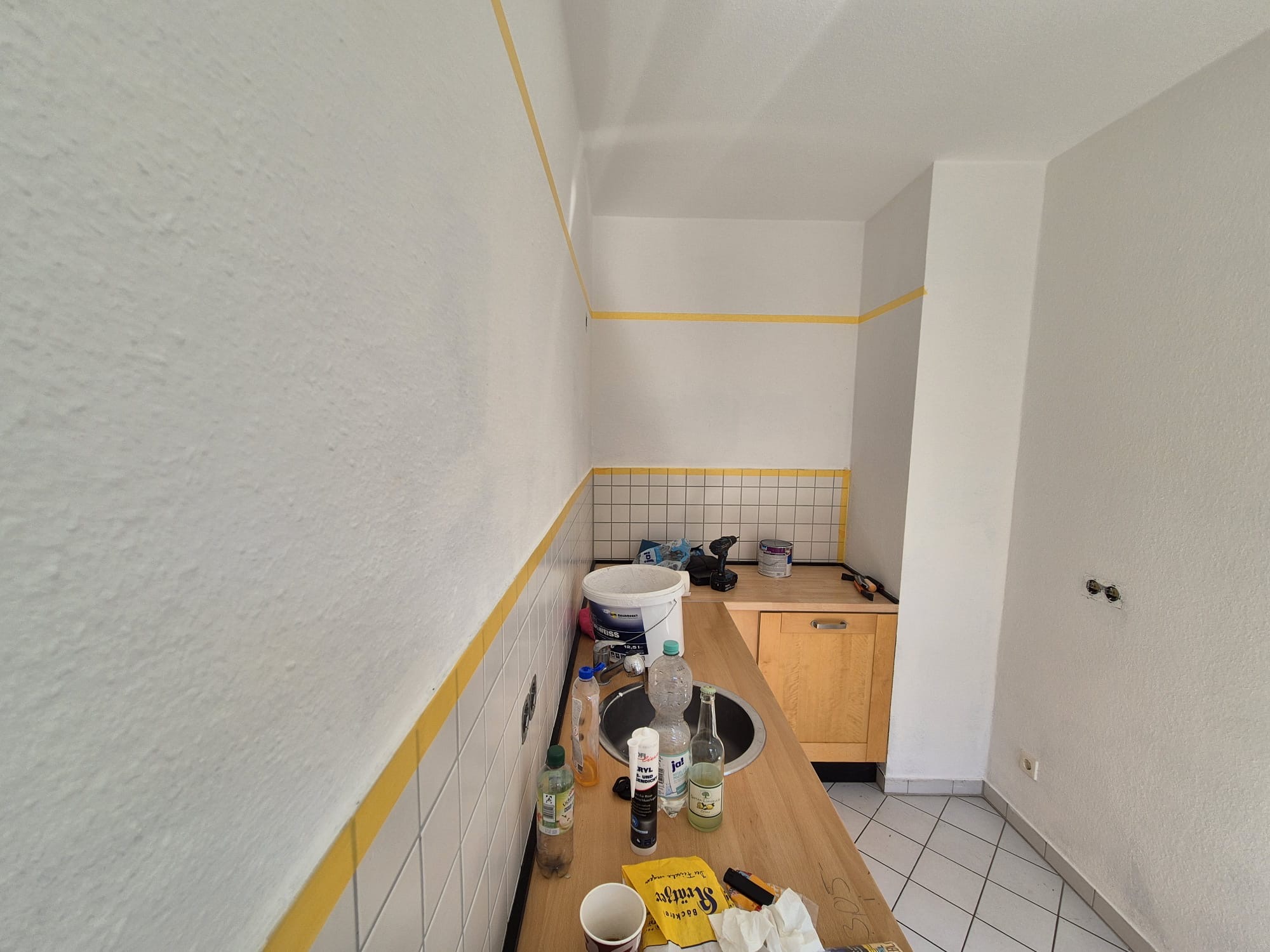 Die Wandflächen im Schlafzimmer, Wohnzimmer und der offenen Küche wurden farblich gestaltet(NAN). Die vom Kunden bestellten Möbel wurden montiert. Der Eingangsbereich der Wohnung mit einem akustisch wirksamen Wandbelag gestaltet. Zusätzlich wurde eine Garderobenfläche geschaffen und Kleinmöbel im Badezimmer installiert.
