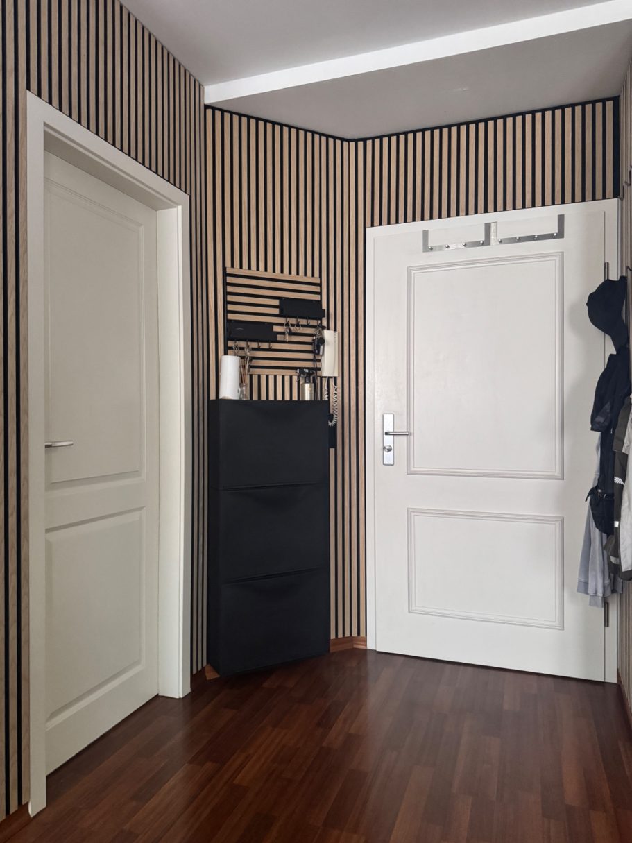 Die Wandflächen im Schlafzimmer, Wohnzimmer und Küche wurden farblich abgesetzt (NAN). Der Eingangsbereich der Wohnung erfolgte die Montage einer Garderobe mit einem akustisch wirksamen Wandbelag.